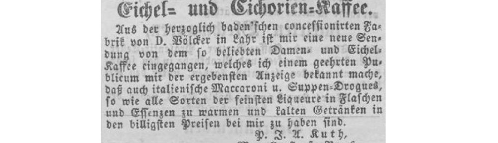 Festzuhalten ist aber auch, dass ab den 1810er Jahren die Belegstellen für einen regulären Absatz von Eichelkaffee zunehmen. Wenzel Storch, wohl kein Vorfahre des bekannten Trashfilmers gleichen Namens, verkaufte seit spätestens 1812 Eichelkaffee in Wien in Pfund-, Halb- und Viertelpfundpaketen (Wiener Zeitung 1812, Ausg. v. 4. Januar, 12). Es handelte sich laut Werbung um „ein stärkendes nahrhaftes, und Verdauung beförderndes Getränk“ (Wiener Zeitung 1813, Nr. 13 v. 30. Januar, 7). Der Paketinhalt wurde im Haushalt mit Wasser wohl eine Viertelstunde gekocht und anschließend gefiltert. Lauwarm, teils kühl, ergänzt um Zucker und Milch sollte er dann „gegen Schwäche der Verdauung, Atrophie, Scrofeln, Rhachitis“ helfen (Justus Radius, Auserlesene Heilformen, 2. umgearb. Aufl., Leipzig 1840, 606 [Bericht von 1813, US]). Ein Zusatz von Bohnenkaffee konnte den Geschmack natürlich verbessern, minderte aber nicht die vermeintliche medizinische Wirkung. Eichelkaffee wurde zunehmend von Kaffeesurrogatfabrikanten hergestellt, meist kleinen Anbietern für einen lokalen Markt (Wiener Zeitung 1829, Nr. 129 v. 6. Juni, 916). Doch er blieb auch Apothekerware. Die meisten mir vorliegenden Anzeigen finden sich dabei im österreichischen und bayerischen Bereich – aber es ist nicht klar, ob dies aus der Fokussierung auf die digitalisierten Bestände etwa der Österreichischen Nationalbibliothek, der Bayerischen Staatsbibliothek, von Internet Archive oder Google Books resultiert oder ob in den digitalisierungsfaulen Regionen Deutschlands ehedem wirklich kaum Eichelkaffee konsumiert wurde.