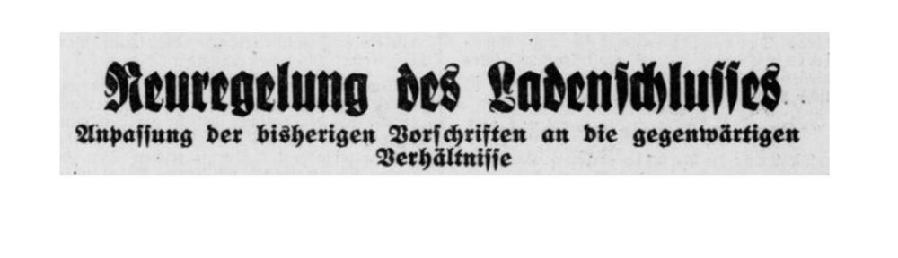 Moderne Ladenschlussregelungen bilden einen Kompromiss zwischen sozialpolitischen Ansprüchen, unternehmerischer Verwertungsimperativen, den kaum begrenzten Konsumwünschen der Verbraucher und dem Ordnungsanspruch des Staates. Die 1891 einsetzende Gesetzgebung hatte unter eindeutig sozialpolitischen Gesichtspunkten zu einer begrenzten Sonntagsruhe und verbindlichen werktäglichen Öffnungszeiten geführt. Diese wurden während des Ersten Weltkrieges weiter verringert. Die temporäre Einführung des Acht-Stundentages und zahlreiche Tarifverträge trennten zu Beginn der Weimarer Republik dann Arbeitszeiten und Ladenöffnungszeiten. Die Verordnung vom 5. Februar 1919 legte einen werktäglichen Ladenschluss in der Zeit von 19 bis 7 Uhr fest, deklarierte ferner den Sonntag grundsätzlich als Ruhetag. Es gab zahllose Ausnahmen, wobei insbesondere Lebensmittel und andere Güter der Grundversorgung auch früher, später oder aber am Sonntag eingekauft werden konnten. Größere Betriebe konnten darauf mit Schichtsystemen reagieren, während kleinere Einzelhändler überdurchschnittliche Arbeitszeiten in Kauf nehmen mussten, wollten sie die Läden so lange offenhalten wie die Konkurrenz. Diese Struktur galt auch noch 1933, nach der Machtzulassung der Nationalsozialisten und ihrer konservativen Koalitionspartner (Uwe Spiekermann, Freier Konsum und soziale Verantwortung. Zur Geschichte des Ladenschlusses in Deutschland im 19. und 20. Jahrhundert, Zeitschrift für Unternehmensgeschichte 49, 2004, 26-44).