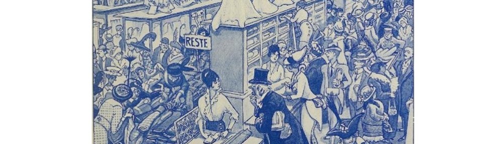 Folgen wir den Zeichnern in die Mitte der Stadt, so erscheint diese als dynamischer Ort des Konsums und der funktionalen Vergesellschaftung. Die Verdichtung war unmittelbar erfahrbar, die kollektiven Transporttechnologien reichten kaum mehr aus. Sinnenmächtig fanden sich allüberall Werbebotschaften, Markenartikel kündeten von den hochwertigen Produkten der im Hintergrund rauchschwangeren Industrie, deren Internationalität „Kodak“ dokumentiert. Umrahmt von Magazinen und Bazaren, stand im Mittelpunkt raumgreifend der moderne Menschenfänger, das Warenhaus. Er offerierte nicht nur Waren, sondern lenkte die Menschen auf den Preis der Güter als deren verlässlichen Wertmaßstab. Wer hier nicht mithalten konnte, dem winkte „Credit“.