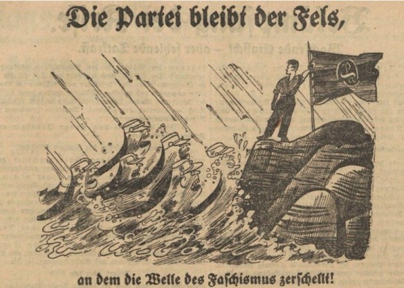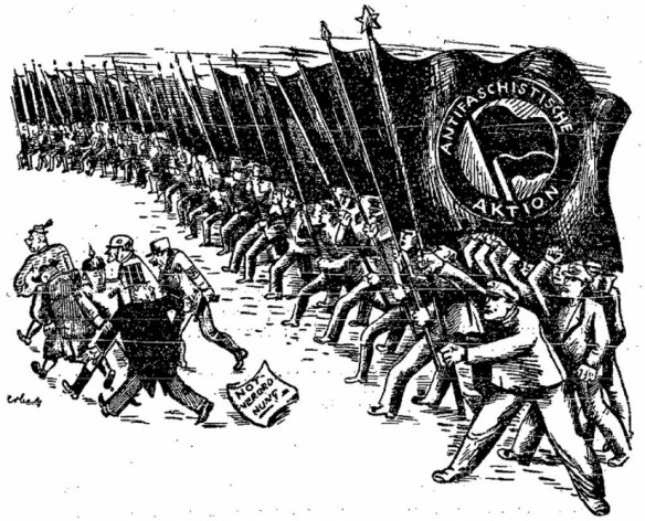 Die Fahnen der kommunistischen Antifaschistischen Aktion wehen gegen Junker, „Klerikalfaschisten“, Monarchie, Militär, Unternehmer und auch Nationalsozialisten (Die Rote Fahne 1932, Nr. 146 v. 3. Juli, 1)