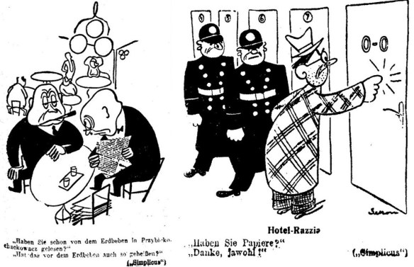 Nicht nur Anti-NS-Karikaturen: Humoristische Zeichnungen aus dem „Simplicus“ (Prager Tagblatt 1934, Nr. 81 v. 7. April, 3 (l.); ebd., Nr. 87 v. 14. April, 4)