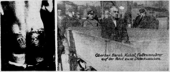 Fotos des NS-Terrors: Rückenansicht eines gefolterten Arbeiters; Demütigung des früheren SPD-Reichstagsabgeordneten Bernhard Kuhnt (1876-1946) in Chemnitz (Sozialdemokrat 1933, Nr. 84 v. 8. April, 3 (l.); ebd., Nr. 87 v. 12. April, 6)