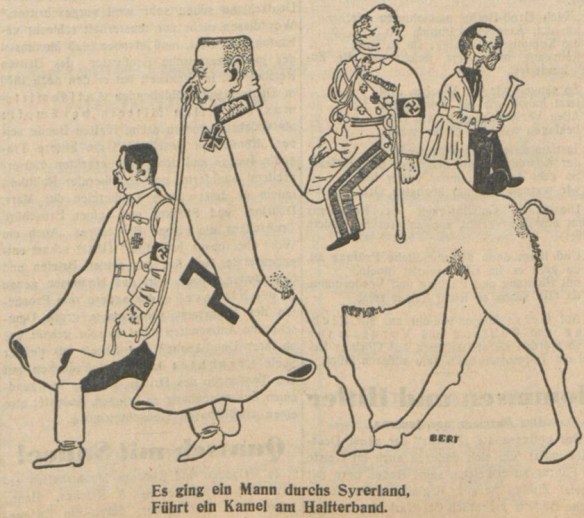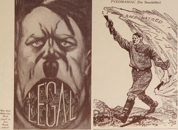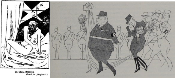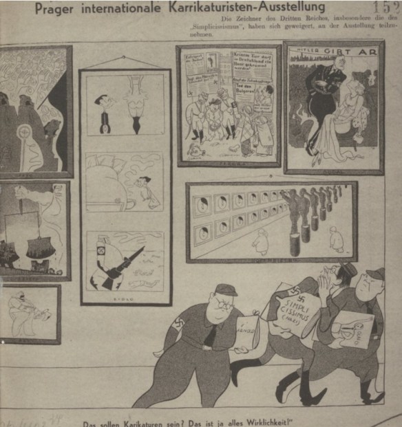 Parallel etablierte sich die politische Karikatur. Die Stuttgarter Staatsgalerie hatte parallel „Die politische Karikatur und Satire in der Zeichnung der Gegenwart“ präsentiert, wo Heines Ex-Kollegen vom „Simplicissimus“, vorwiegend aber die Zeichner der 1931 gegründeten nationalsozialistischen Karikaturzeitschrift „Die Brennessel“ ein Forum erhielten (Mjölnir stellt aus, NS-Kurier 1934, Nr. 124 v. 15. März, 5). Eine kurz darauf in Stockholm eröffnete Karikaturenausstellung fand aufgrund ihrer Völkerbundkritik deutsches Wohlwollen („Das Testament von Genf.“, Erzgebirgischer Volksfreund 1934, Nr. 118 v. 24. Mai, 1). Welche Bedeutung die NS-Machthaber der Karikatur zumaßen zeigte sich auch im Konzentrationslager Dachau, wo Häftlinge den Speisesaal „mit Karikaturen von Sozialdemokraten, Zentrumsführern, Juden und Kommunisten des alten Regimes“ ausgestalten mussten. Das Schriftband höhnte “Das waren sie!“ (Besuch in Dachau, Deutsche Freiheit 1934, Nr. 98 v. 28. April, 2) Und Goebbels hatte sich während der „Kampfzeit“ immer wieder über kritische Karikaturen gefreut: „Das 8 Uhr Abendblatt bringt eine gemeine Karikatur von mir. Immerzu! Vor!“ (Joseph Goebbels, Tagebücher 1924-1945, hg. v. Ralf Georg Reuth, 3. Aufl., München und Zürich 2003, 408; vgl. auch 487)