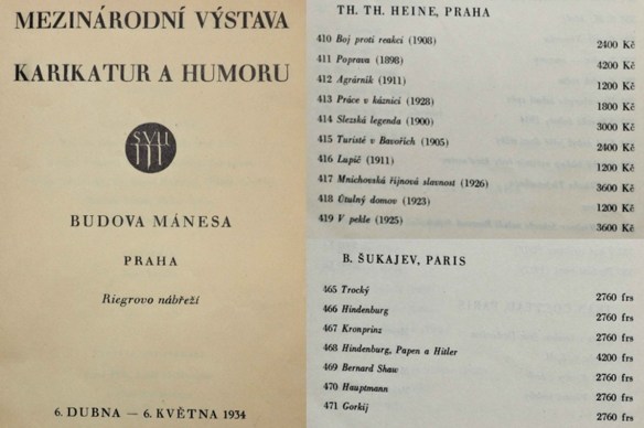 Die für einen Monat angesetzte Internationale Ausstellung für Karikatur und Humor wurde am Freitag, dem 6. April 1934, durch den Architekten und Mánes-Präsidenten Josef Gočár (1880-1945) eröffnet. Sie war abermals von Emil Filla, Adolf Hoffmeister und Alois Wachsmann organisiert worden, ein Ausschuss von vierzehn Mánes-Mitgliedern begleitete Konzeption und Umsetzung. Dreiundvierzig Künstler stellten aus, einundzwanzig Tschechen, fünfzehn Franzosen, je ein Belgier, Däne und US-Amerikaner. Hinzu kamen vier staatenlose Emigranten aus Deutschland, neben Heine und Heartfield auch Otto Dix (1891-1969) und George Grosz (1893-1959). Zwei Aussteller waren bereits verstorben, zwölf der französischen Künstler entstammten mit jeweils ein bis zwei Karikaturen dem Kreis der Karikaturzeitschrift „Le Rire“. Der Katalog verzeichnete 536 Exponate, gezeichnete Karikaturen, Gemälde, Heartfields Fotomontagen. Die Organisatoren hatten auch deutsche Karikaturisten eingeladen, doch Heines Exkollegen, die NS-treuen „Simplicissimus“-Zeichner, sagten anders als 1932 dankend ab (Neues Wiener Tagblatt 1934, Nr. 24477 v. 13. April, 2).