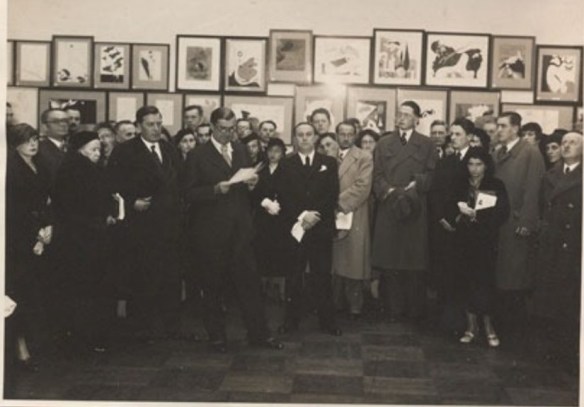Eröffnung der Internationalen Ausstellung für Karikatur und Humor am 6. April 1934 durch Mánes Präsident Josef Gočár