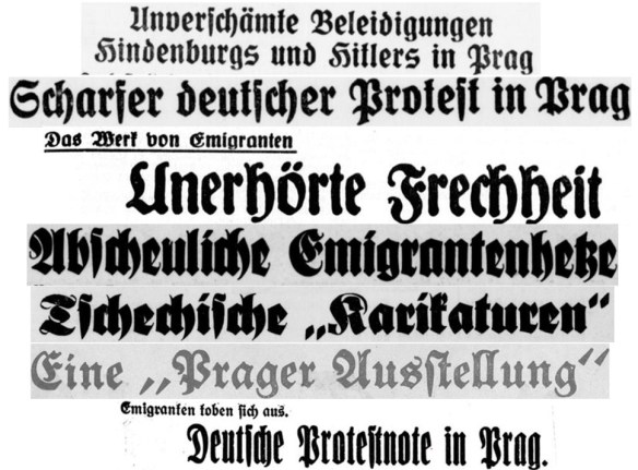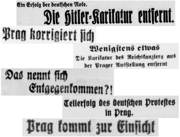 Anlass dieses moralischen Überschwangs war eine am Vortag vom deutschen Gesandten in Prag dem tschechischen Außenministerium zugeleitete Demarche: Dr. Koch habe „in einer Verbalnote beim Außenministerium gegen diese erneuten Beleidigungen und Verunglimpfungen des Reichspräsidenten, des Reichskanzlers und anderer führender deutscher Staatsmänner sowie gegen die Herabwürdigung des deutschen politischen Lebens und der Staatssymbole schärfste Verwahrung eingelegt. Die Verbalnote weist darauf hin, dass das Zeigen dieser Darstellungen an verkehrsreichen Stellen im Zentrum der Stadt, teils öffentlich, teils in einer Aufsehen erregenden Ausstellung mit dem offensichtlichen Zweck, Haßgefühle gegen das Deutsche Reich hervorzurufen, geeignet ist, die Beziehungen zwischen der Tschechoslowakei und dem Deutschen Reiche zu gefährden. Das tschechoslowakische Außenministerium wird daher dringend ersucht, für die beschleunigte Entfernung dieser Machwerke Sorge tragen zu wollen“ (Unverschämtheiten in Prag, Pulsnitzer Anzeiger 1934, Nr. 86 v. 13. April, 1).