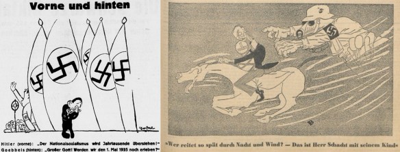 Das NS-Regime in der Krise. Karikatur von Erich Godal und Bert—József Jusztusz (Sozialdemokrat 1934, Nr. 101 v. 1. Mai, 6 (l.); Neuer Vorwärts 1934, Nr. 43 v. 8. April, 5)