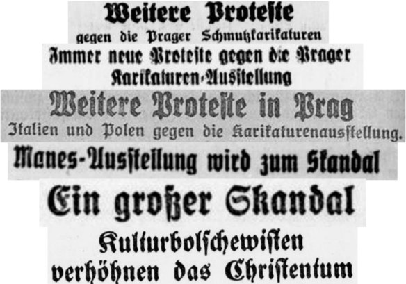 Die deutschen Proteste gegen einzelne Karikaturen der Mánes-Ausstellung hatten 1934 Rammbockqualität. Es folgten weitere Proteste, erst aus Österreich, dann aus Polen und Italien, schließlich still aus dem Vatikan. Sie bewirkten mehr Abhängungen als die deutsche Intervention. Zurück blieb eine vielfach gerupfte Ausstellung, teils aus Opportunitätsabwägungen der tschechischen Regierung, teils aufgrund der rechtsstaatlichen Eingriffe der Polizei.