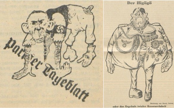 Angesichts der weiter oben angerissenen Auseinandersetzungen zwischen Emigranten und staatlichen Autoritäten war für erstere ein genaueres Eingehen auf die Ereignisse in Prag risikobehaftet; das überließ man daher fest etablierten linken Parteien wie etwa der deutsch-tschechischen Sozialdemokratie. Man selbst informierte, so etwa mittels der vielfach nachgedruckten DNB-Meldung über das deutsche Vorgehen (Hitlers Karrikatur [sic!], Deutsche Freiheit 1934, Nr. 87 v. 15. April, 2). Die eigenen Leser würden sich darauf schon ihren eigenen Reim machen können. Für pointiertere Aussagen nutzte man zweitens Zitate, etwas des kommunistischen „Prager Mittags“. Demnach fühlte sich die deutsche Regierung von den Karikaturen hart getroffen, führe deshalb die „schärfsten Geschütze des diplomatischen Verkehrs“ auf (Angst vor Satire, Pariser Tageblatt 1934, Nr. 125 v. 16. April, 2, auch für das Folgende). Das deutete man als Angst vor der Kunst, vor der Wahrheit der Bilder. Zudem unterstützte man den Künstler der eigenen Seite in seiner Freiheit, „die Dinge so darzustellen, wie er sie sieht“. Drittens präsentierte man die Angriffe als Ausdruck der Schwäche gegenüber wirksamen Karikaturen. Die „braunen Herren“ hätten eben „zarte Nerven und dann tun ihnen sogar Karikaturen weh, die in Prag ausgestellt werden“ („Ich sage gar nichts“, Deutsche Freiheit 1934, Nr. 127 v. 13. Juni, 5).