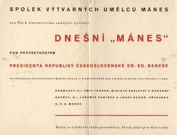Mit staatlicher Unterstützung: Einladung zur Ausstellungseröffnung (Dnešní Mánes | Databáze uměleckých výstav v českých zemích 1820 – 1950)