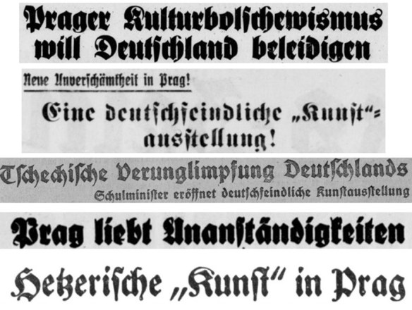 Die derweil nach vielen staatpolitisch relevanten Einsätzen brav mitziehenden Schriftleiter wussten, dass im Sinne deutscher Auftragstaktik mehr erwartet wurde. Vom hohen Ross des vermeintlich Verunglimpften folgten unvermittelt zahlreiche ergänzende Kommentare. Auch diese Ausstellung sei „eine Verhetzung der Menschen gegen ein friedliebendes Volk, das nur die Knechtschaft jener Minderwertigen von sich abgeschüttelt hat, die sich jetzt auch in dieser tschechischen Ausstellung wieder als ein Konsortium der überall Gleichen gefunden haben und im Sinne des Kulturbolschewismus Propaganda machen. Wir sind gewiß, daß die deutsche Reichsregierung mit ihrer Meinung in Prag über diesen Skandal nicht hinter dem Berge halten wird. Denn darin ist sich das deutsche Volk bis auf den letzten Mann einig, daß es seinen Führer und sich selbst nicht von solch minderwertigen Hetzern beleidigen läßt“ (Prager Kulturbolschewismus will Deutschland beleidigen, Velberter Zeitung 1937, Nr. 279 v. 13. Oktober, 1).