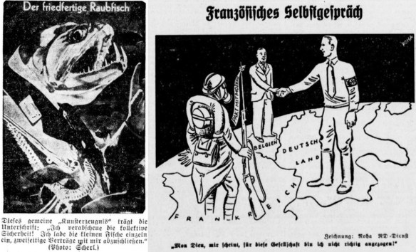Visualisierung vermeintlicher Doppelstandards: Göring als Raubfisch und Deutschland als Friedensmacht nach der Zusicherung der „Unverletzlichkeit und Integrität“ der belgisch-deutschen Grenze (Lenneper Kreisblatt 1937, Nr. 241 v. 15. Oktober, 2 (l.); Westfälische Landeszeitung 1937, Nr. 243 v. 16. Oktober, 1)