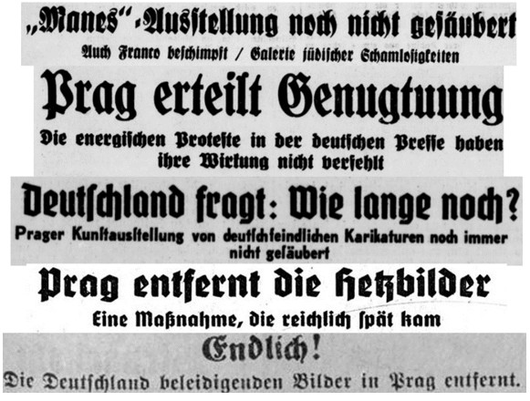 Der deutsche Protest gegen die Karikaturen und Fotomontagen war vorhersehbar. Schon Anfang Oktober hatte es eine Art Vorglühen gegeben, hatte eine vom Verband der tschechischen Frontkämpfer veranstaltete Prager Antikriegsausstellung doch mit zahlreichen Beispielen begeisterter Kriegskarikaturen versucht, dem neuerlichen Rüsten Einhalt zu gebieten. Im Deutschen Reich wurde die angeprangerte „Deutsche Barbarei“ im Kontext der feindlichen Kriegspropaganda des Weltkriegs verstanden. Das galt als „Hetze gegen alles Deutsche“ (Tschechischer ‚Frontgeist‘, Bote für Stadt und Land 1937, Nr. 269 v. 1. Oktober, 1). Auch österreichische Journalisten bliesen zur Abwehr, aktivierten die Erinnerung an 1934: „Die Manes-Karikaturen-Ausstellung des Jahres 1934, die sogar mit diplomatischen Rückwirkungen verbunden war und beispielsweise das zweimalige Einschreiten des damaligen Prager deutschen Gesandten erforderlich machte, dürfte noch in zu frischer Erinnerung sein, als daß man auf tschechischer Seite versuchen wollte, die der Ausstellung zugrundeliegende antideutsche Tendenz abzuschwächen oder überhaupt zu leugnen“ (Eine skandalöse Ausstellung, Salzburger Volksblatt 1937, Nr. 228 v. 5. Oktober, 1).