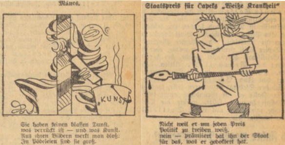 Typisch hierfür war das Wechselspiel mit den sudetendeutschen Nationalsozialisten. Einerseits etablierte man sich als deren Schutzmacht, tönte markig: „Wer die Sudetendeutschen provoziert, der provoziert das deutsche Volk“ (Die Logik des Gummiknüppels, Gelsenkirchener Zeitung 1937, Nr. 286 v. 19. Oktober, 1). Anderseits attackierten diese in Text und Karikatur deutschlandkritischen Künstler. Typisch hierfür war etwa das Werk des sudetendeutschen Karikaturisten Erik—Hanns Erich Koehler (1905-1983), der nach der Okkupation der Tschechoslowakei nicht nur zu einem der führenden NS-Propagandazeichner im Reich werden, sondern als Karikaturist von „FAZ“, „Welt“ und „Die Zeit [Hamburg]“ zum bildprägenden politischen Karikaturisten der Bundesrepublik aufsteigen sollte (Manfred Kretschmer, Alte Kameraden: Köhler, Iversen, Ifland und der Simplicissimus, Deutsche Comicforschung 20, 2024, 96-123, insb. 96-103). Erik karikierte die „antifaschistische“ Mánes-Ausstellung mit wirren Strichen: „Sie haben keinen blauen Dunst, / was verrückt ist – und was Kunst. / Aus ihren Bildern merkt man bloß. / In Pöbeleien sind sie groß“ (Die Zeit [Reichenberg] 1937, Nr. 245 v. 17. Oktober, 3). In seinen wöchentlichen Bildkommentaren legte er schon zwei Wochen später nach, attackierte die Verleihung des tschechischen Staatspreises an Karel Čapek für sein bis heute eindringliches Drama „Die weiße Krankheit“.