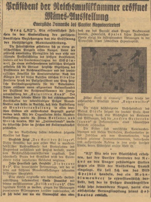 Prag blieb Mitte der 1930er Jahre ein Zentrum der deutschen Exilkultur und des europäischen Kulturlebens. Ein Beispiel hierfür war die Mánes-Fotoausstellung 1936, die Werke von sechs tschechischen Avantgarde-Fotografen und zudem von John Heartfield, Man Ray (1890-1976), László Moholy-Nagy (1895-1946), Alexander Rodtschenko (1891-1956) und Arkadi Schaichet (1898-1959) präsentierte. Heartfields Fotomontagen fanden besonderes Interesse, doch eine Intervention der deutschen Seite blieb aus (Abseits von der Reichskulturkammer, Das Neue Tage-Buch 4, 1936, 285). Gleichwohl lenkte die schon 1934 gestellte Frage „Wann ist in Prag der nächste Skandal fällig?“ in die richtige Richtung (Prager Skandale, Bautzener Nachrichten 1934, Nr. 96 v. 25. April, 1). Anlass bot dann die Ausstellung „Die heutige Mánes“ (Dnešní Mánes), die vom 12. Oktober bis 28. November 1937 gezeigt wurde.