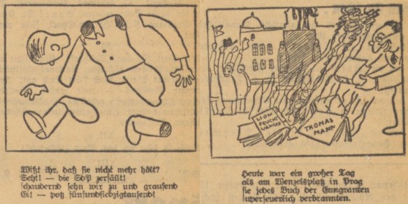 Wie nicht anders zu erwarten, steuerte auch Erik—Hanns Erich Koehler einige eigene Karikaturen bei – angelehnt an die übliche Fünferspalte seiner Wochenrückblicke. Sie waren von Wunschbildern der noch Herrschenden geprägt, etwa dem dekonstruktivistisch präsentierten Zerfall der Sudetendeutschen Partei. Doch sie führten auch Drohendes vor, etwa eine Bücherverbrennung der Werke Lion Feuchtwangers (1884-1958) und Thomas Manns (1875-1955) auf dem Prager Wenzelsplatz: Hart und zart, wie es sich für einen Künstler des Striches gehört.