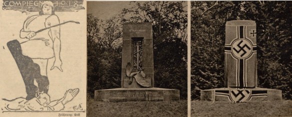 Karikatur von Erik—Hanns Erich Koehler zur Schmach von Compiègne und Verdeckung des französischen Siegesdenkmal in Compiègne mit der Reichskriegsflagge anlässlich der Unterzeichnung des deutsch-französischen Waffenstillstandes am 22. Juni 1940 (Die Zeit [Reichenberg] 1940, Nr. 172 v. 23. Juni, 4 (l.); Die Wehrmacht 4, 1940, Sdr.-Ausg., 3)