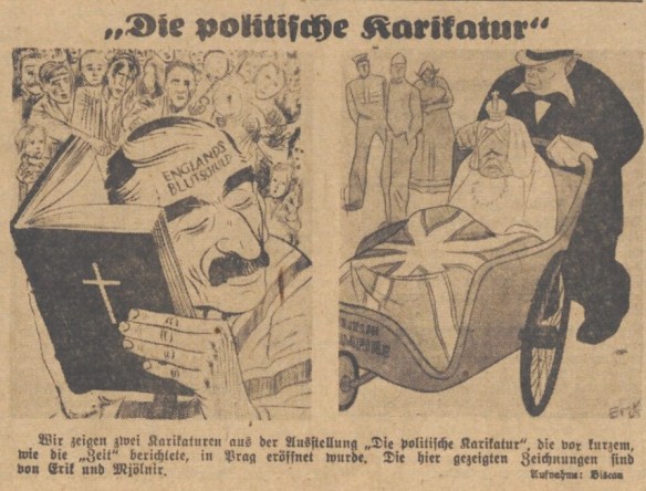 Antibritische Karikaturen aus der Prager Karikatur-Ausstellung im Mánes-Pavillon im April/Mai 1940: Exponate von Mjölnir—Hans Schweitzer und Erik—Hanns Erich Köhler (Die Zeit [Reichenberg] 1940, Nr. 116 v. 27. April, 7)