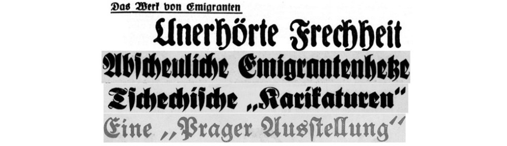 Am 13. Oktober 1937 gab eine morgendliche Presseanweisung die Order zur Attacke. Auf Grundlage eines detaillierten Berichtes über die Prager Eröffnungsfeier in der von deutschen Geldern unterstützten Reichenberger Tageszeitung „Die Zeit“ (Neues Mánes-Skandal in Prag, Die Zeit [Reichenberg] 1937, Nr. 241 v. 13. Oktober, 2) verschickte das Deutsche Nachrichtenbüro abermals eine verpflichtend abzudruckende Meldung. Lapidar hieß es „Die Ausstellung enthält eine ganze Reihe von deutsch-feindlichen Karikaturen“ (Neue Herausforderung in Prag, Kölnische Zeitung 1937, Nr. 519 v. 13. Oktober, 2, auch für das Folgende). Sie wurden benannt und beschrieben – und empört koppelte man diese mit der gleichsam offiziellen Ansprache des Ministers Emil Franke: „Wenn in Deutschland eine Ausstellung mit Schmähungen der geheiligten Prager Demokratie von einem Minister eröffnet würde, möchte man die Entrüstung nicht nur dort sehen! Diese Verunglimpfung Deutschlands soll aber natürlich etwas andres sein, und dazu bietet auch ein tschechoslowakischer Minister deutschen Namens seine Hand. Wird dadurch nicht der Kulturbolschewismus bestätigt, den man in Prag immer ableugnet?“ Die deutsche Presse tönte, die Schlagzeilen dröhnten.